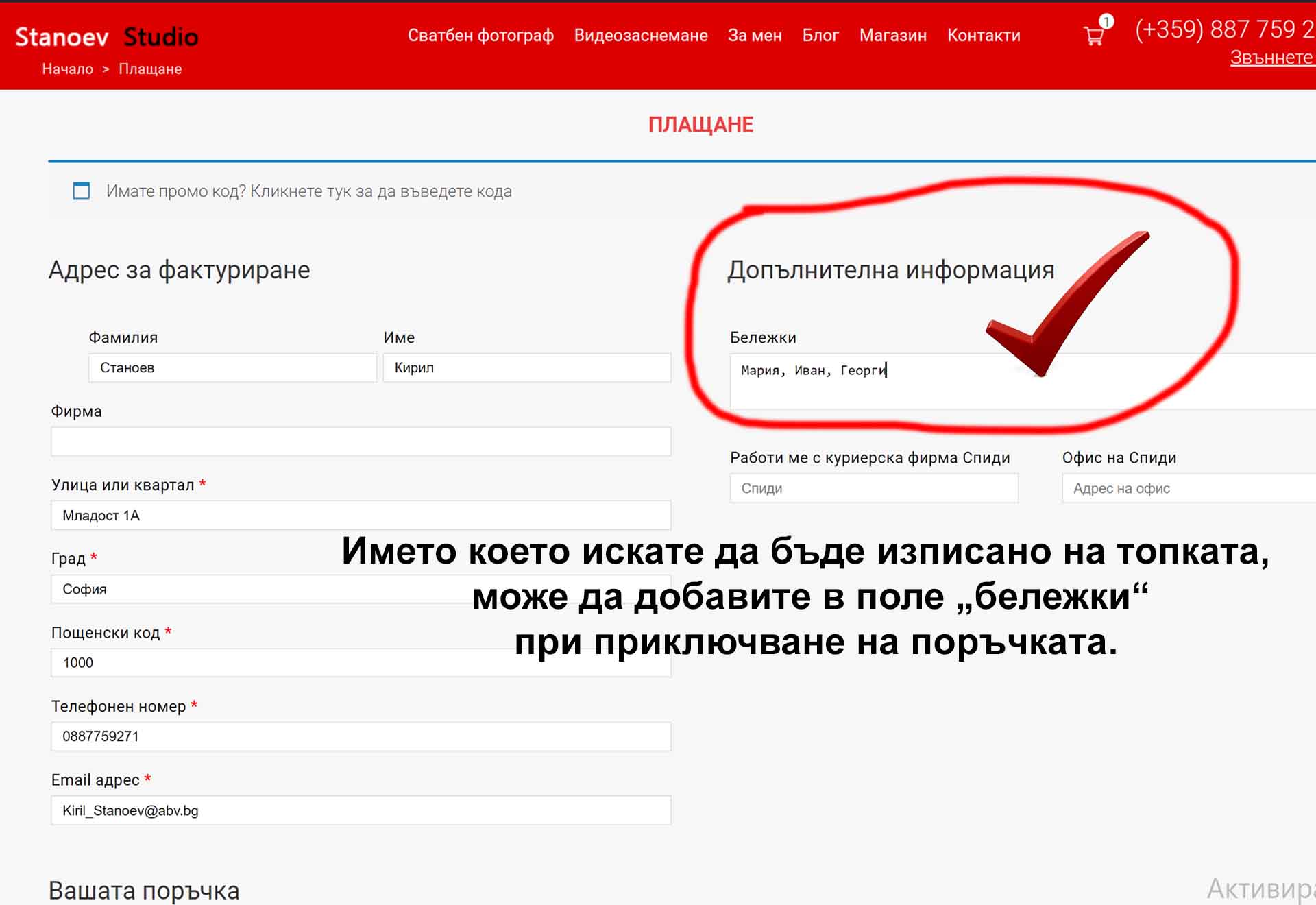 Името което искате да бъде изписано на топката, може да добавите в поле „бележки“ при приключване на поръчката.